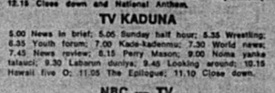 Kano State is in the central Northern-most part of the country. NTV–Kano (channel 5) is the only station for which we have (so far) found published TV listings in the early 1980s.