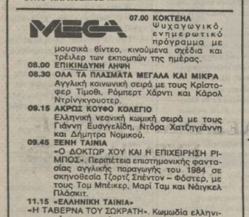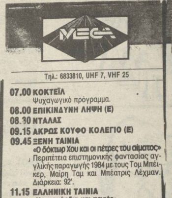 ERT-2-TV commenced its 22-episode run of Doctor Who from Friday, 5 December 1986, at 8.00pm. The newspapers incorrectly give the title as "DOCTOR X", a printing error also repeated on 2 and 9 January 1991.